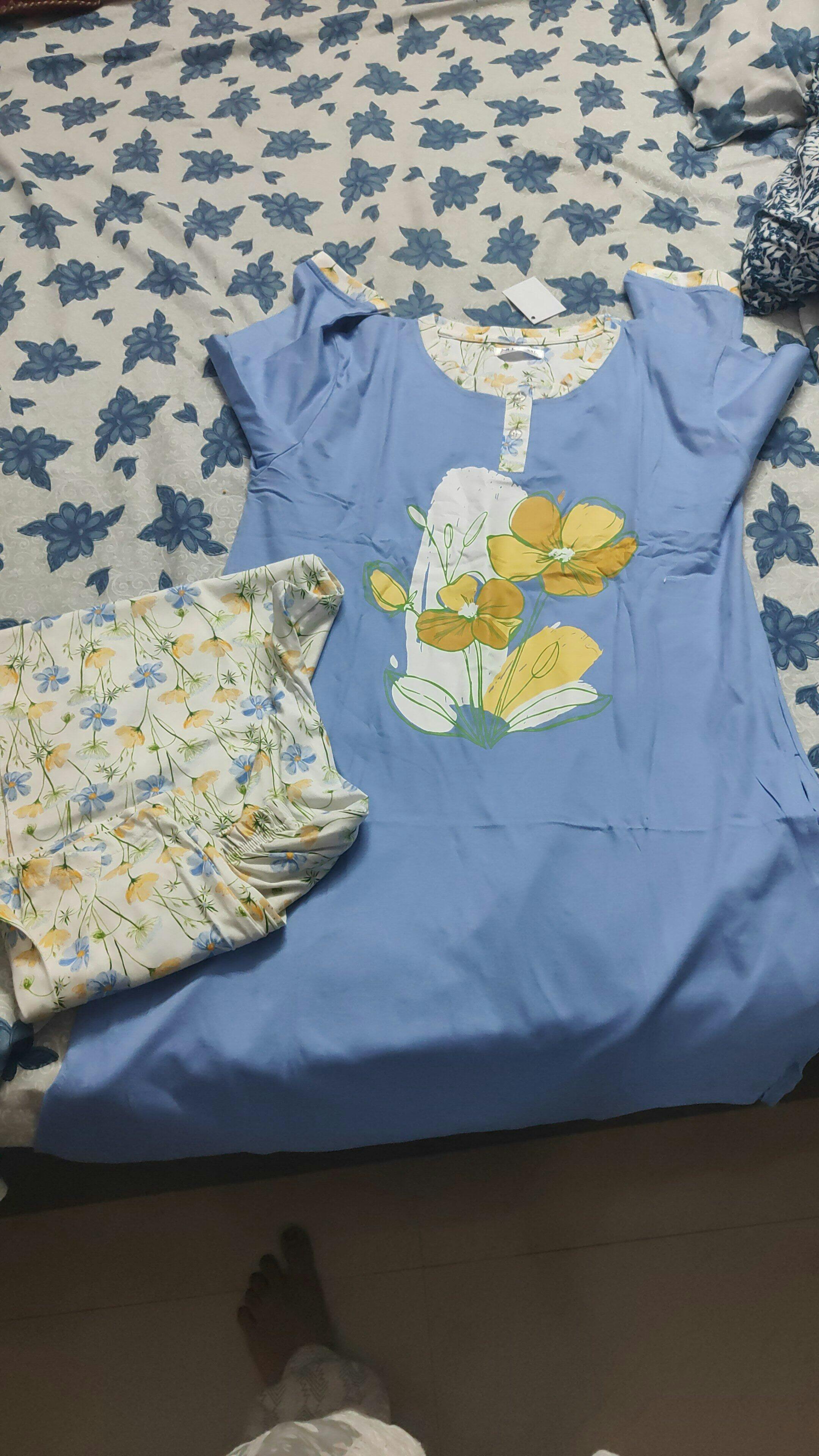 Sky Blue Florals Long T-Shirt Pajama Set (LP3V08)